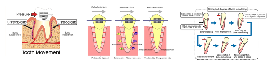 กระดูกเดิมบนด้านที่ถูกบีบอัดจะถูก resorption (สลาย) โดย osteoclasts และด้านที่ถูกดึงจะมีการ deposition (สร้าง) กระดูกใหม่โดย osteoblasts ขบวนการนี้เป็นกุญแจสำคัญที่ทำให้ฟันเคลื่อนที่ได้อย่างปลอดภัยและคงที่ในระยะยาว